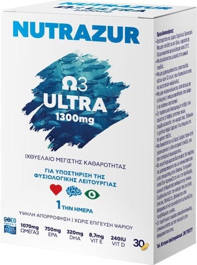 Το Nutrazur Ω3 Ultra είναι ένα συμπλήρωμα διατροφής που περιέχει υψηλής καθαρότητας ιχθυέλαιο, πλούσιο σε EPA και DHA. Αυτά τα ωμέγα-3 λιπαρά οξέα συμβάλλουν στη φυσιολογική λειτουργία της καρδιάς, ενισχύουν τη λειτουργία του εγκεφάλου και υποστηρίζουν την υγεία των αρθρώσεων.